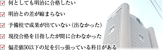 結果を出せていない浪人生が明治に合格するには、受験勉強のやり方を見直すことが必要です。ですが、浪人生が、自分ひとりで正しい明治対策を行うのはかなり難しいと言えます。志望校(学部)の入試傾向、自分の学習状況、苦手教科、弱点・・・こうしたことを踏まえて、いつまでに何を勉強すれば合格できるのか、分かっている浪人生はほとんどいないと思います。